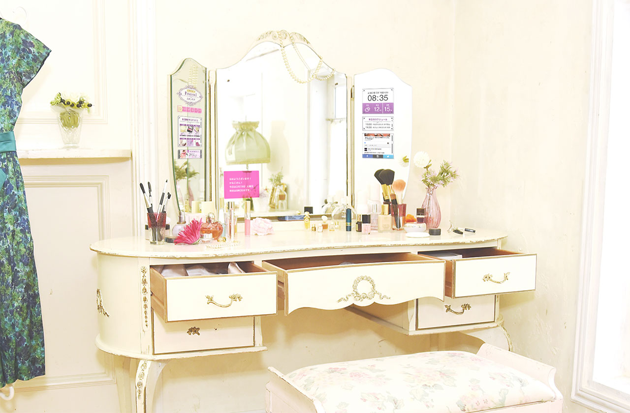 鏡面がディスプレイになっており、さまざまな美容に関するアドバイスや、あなたの手持ちのコスメ管理、SNS連携で、友人との対話を楽しむことも可能です。