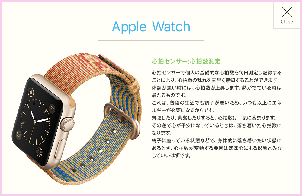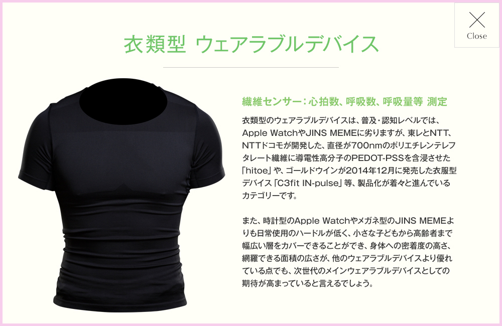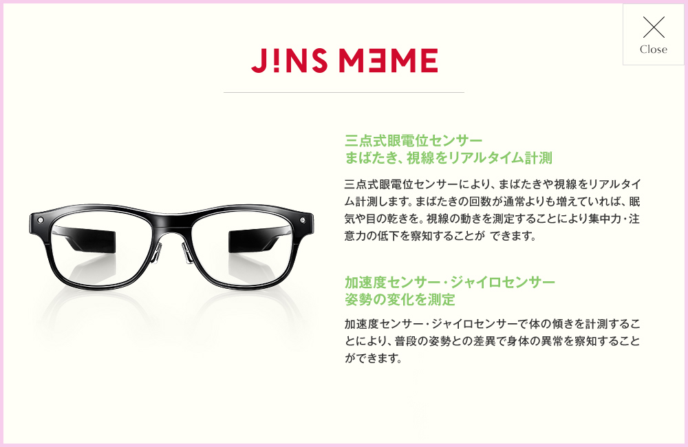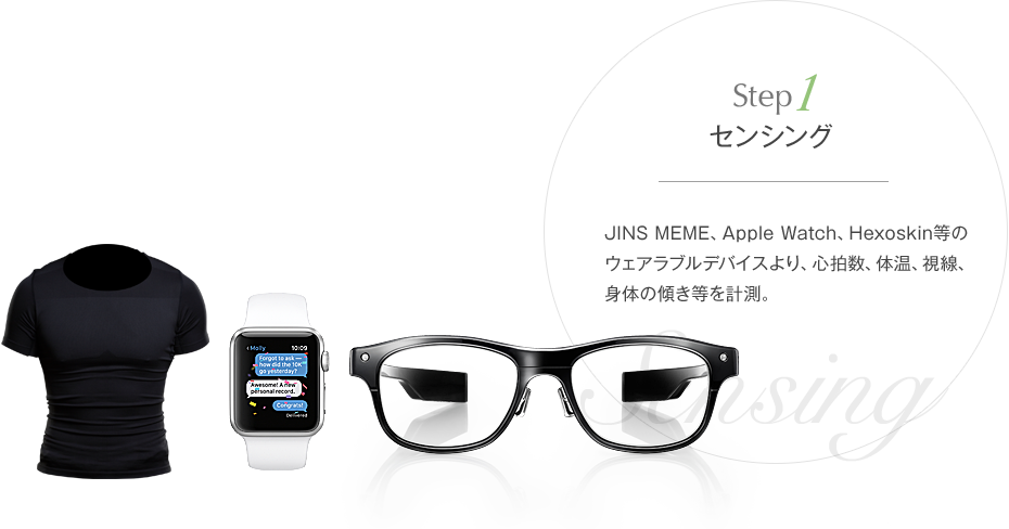 センシング JINE MEME、Apple Watch、Hexoskin等のウェアラブルデバイスより、心拍数、体温、視線、身体の傾き等を計測。