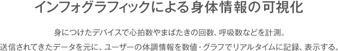 インフォグラフィックによる身体情報の可視化 身につけたデバイスで心拍数やまばたきの回数、呼吸数などを計測。送信されてきたデータを元に、ユーザーの体調情報を数値・グラフでリアルタイムに記録、表示する。