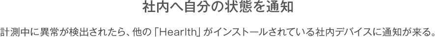 社内へ自分の状態を通知 計測中に異常が検出されたら、他の「Hearlth」がインストールされている社内デバイスに通知が来る。