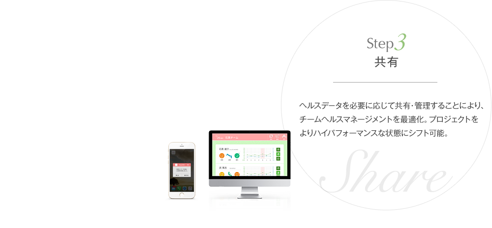 共有 ヘルスデータを必要に応じて共有・管理することにより、チームヘルスマネージメントを最適化。プロジェクトをよりハイパフォーマンスな状態にシフト可能。