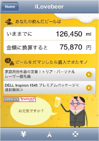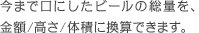 今まで口にしたビールの総量を、金額/高さ/体積に換算できます。
