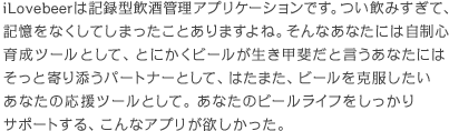 iLovebeerは記録型飲酒管理アプリケーションです。つい飲みすぎて、記憶をなくしてしまったことありますよね。そんなあなたには自制心育成ツールとして、とにかくビールが生き甲斐だと言うあなたにはそっと寄り添うパートナーとして、はたまた、ビールを克服したいあなたの応援ツールとして。あなたのビールライフをしっかりサポートする、こんなアプリが欲しかった。