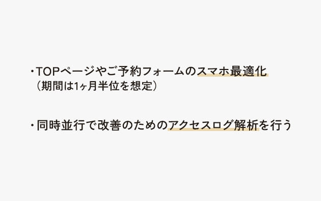 スマホ最適化後、再度アクセスログ解析を実施しました。Google Analyticsの直帰率などの数値は改善しているものの、実際の集患は目標には達していない状況が続いたので再度分析を行いました。その結果、下記2点が課題であると仮説が立て、対応を検討しました。