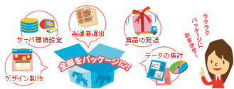 | キャンペーンサイトのデザイン制作から、サーバ環境の設定構築、当選者の選出、賞品の発送、データの集計まで、キャンペーンサイト施策のすべての作業を一貫して請け負います。これまでお客様のご負担となっていた作業を徹底して省き、責任をもって代行します。 |
