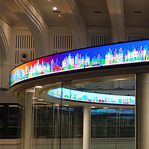 21世紀のマスコミュニケーションにおいてあらゆるメディアで映されるシチュエーションを想定し、タイポグラフィーやカラーリングのルール、レギュレーション設定を追求。絶えず流れてくる株価情報を遅延なく、滑らかにスクロール表示させる安定性の高いソフトウェアを開発しました。確実性や安定性の実現だけでなく、フルカラーの映像を放映できるようになった利点を活かし、株価表示以外に、経済が止まることなく、目まぐるしく動く様子や、証券取引所の歴史をまとめたアニメーションを企画制作し実装することで、右脳的アプローチでエモーショナルに証券取引所の権威や信頼感というブランドプレゼンスを訴求しています。