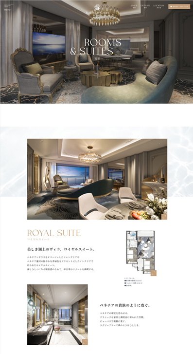 ホテルのコンセプトをデザインに取り入れ、ビジュアル面とインタラクションの両面でサイト全体に浸透させた。ラグジュアリーホテルがもつブランドをweb上で体感することで、ユーザーの共感を得ることを目指した。
