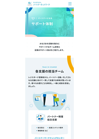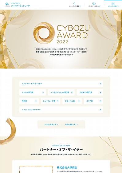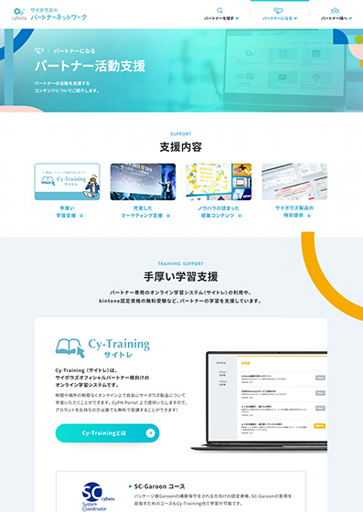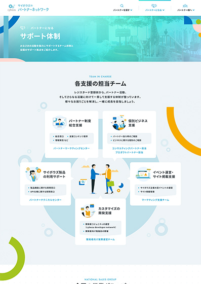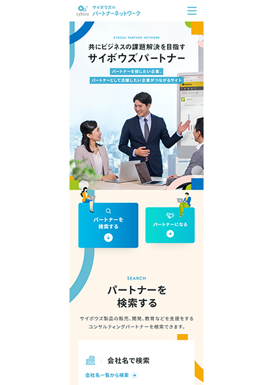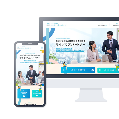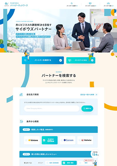 コーポレートサイト内にあった「パートナー検索/募集」の数ページを切り出し、必要な情報をまとめて提示できるサイトとして新規制作。パートナーを探したい企業・パートナーとして活躍したい企業・現パートナー、とステータスの異なる3種類のターゲットが共存するサイトとして、構造・ナビゲーションを設計、各者・サイボウズ間のコミュニケーションをデザインした。ビジュアル・インタラクション面では、サイボウズ社製品に共通する「手軽さ、カジュアルさ、親しみやすさ」などのキーワードに加え、パートナーとしての安心感や頼り甲斐を視覚化し、共に描く未来の明るさを表現。